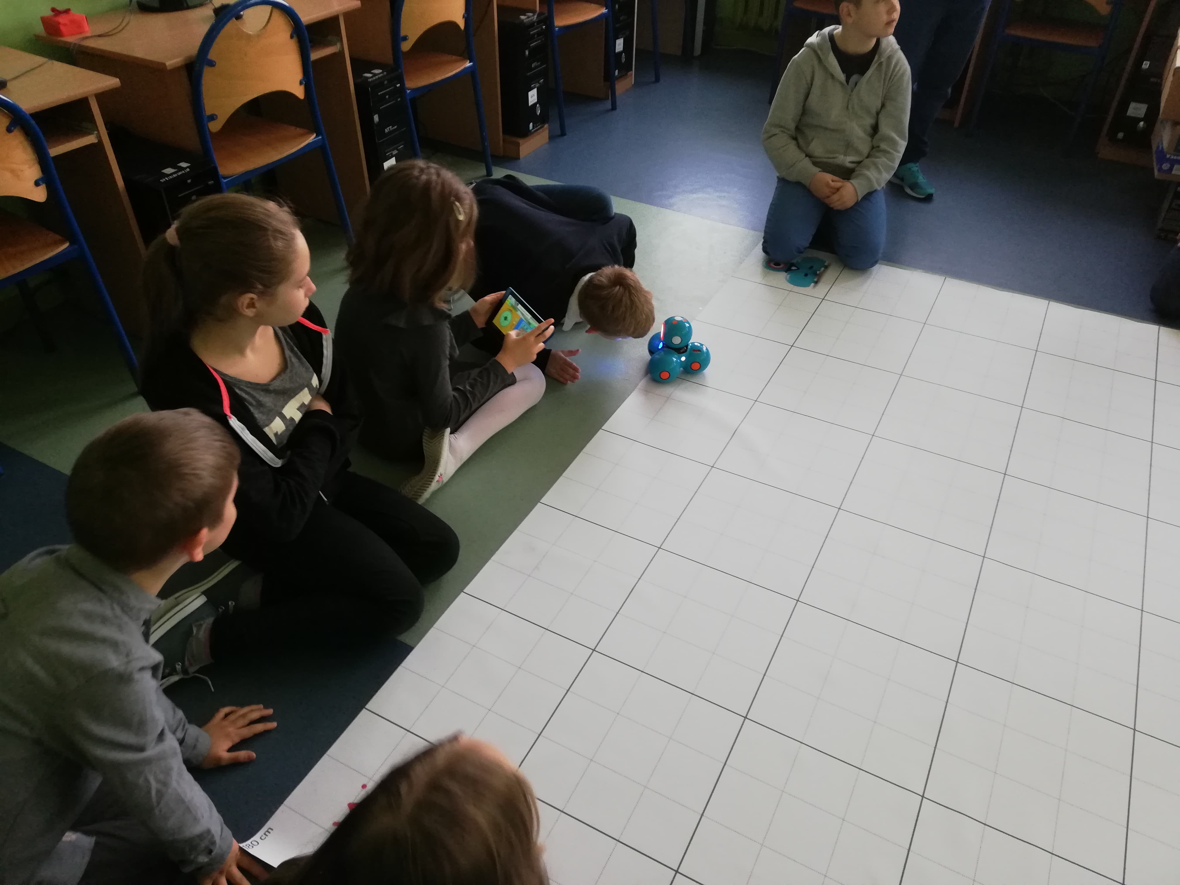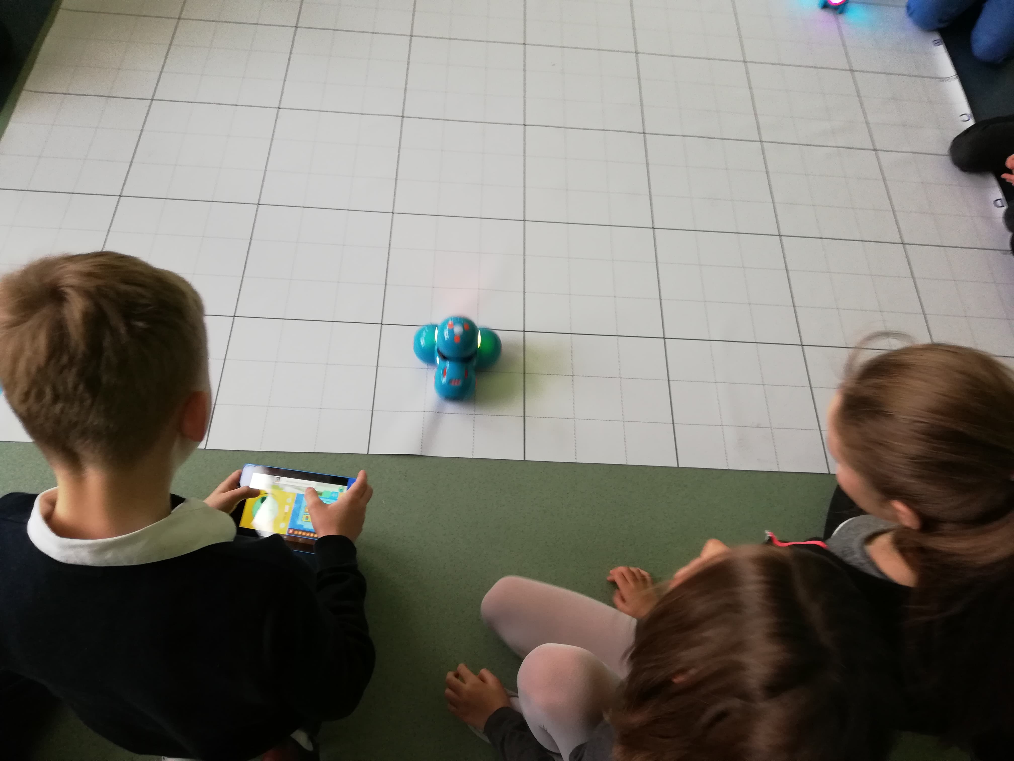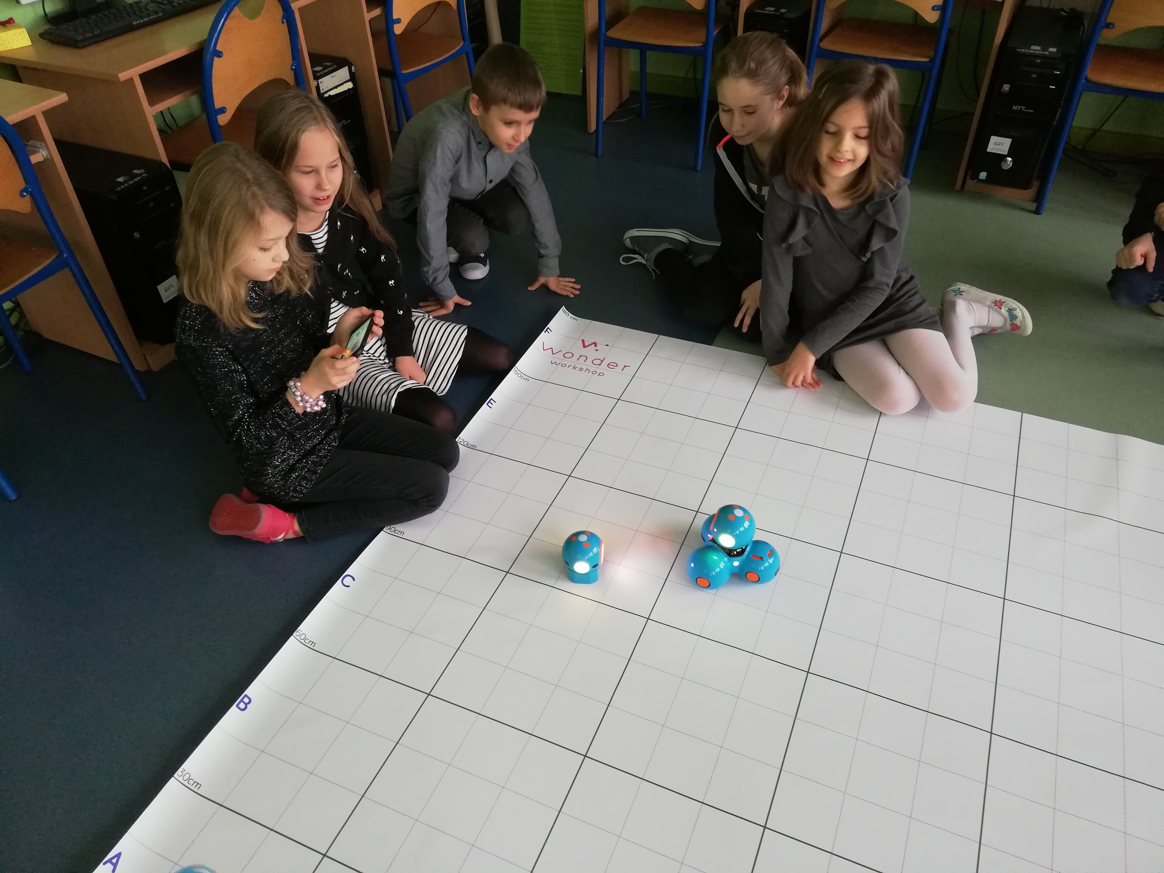 Kolejnym krokiem dla uczniów klasy 4e po pisaniu kodów w ramach Godziny Kodowania było programowanie robotów Dash i Dot. Wszyscy byli bardzo przejęci i zaangażowani w swoją pracę. Rozpoczęliśmy od prostych poleceń dla robotów: poruszanie głową, zmiany kolorów, zarządzanie dźwiękiem, poruszanie się po linii. Okazało się, że pisanie kodów dla robotów, tak aby poruszały się jak sobie wymarzymy wcale nie jest takie łatwe.
