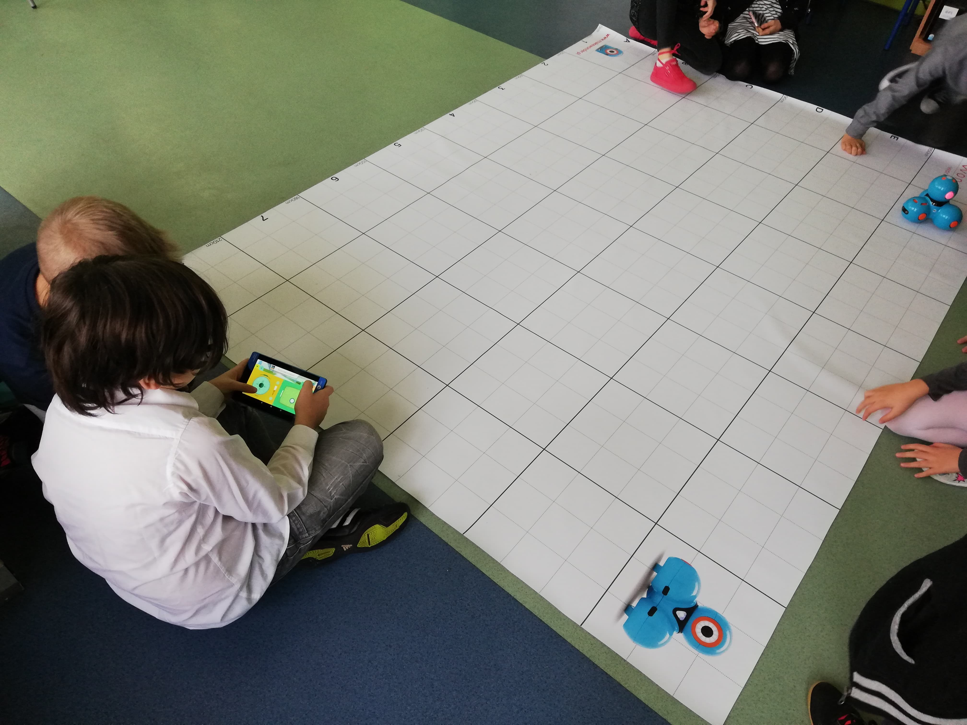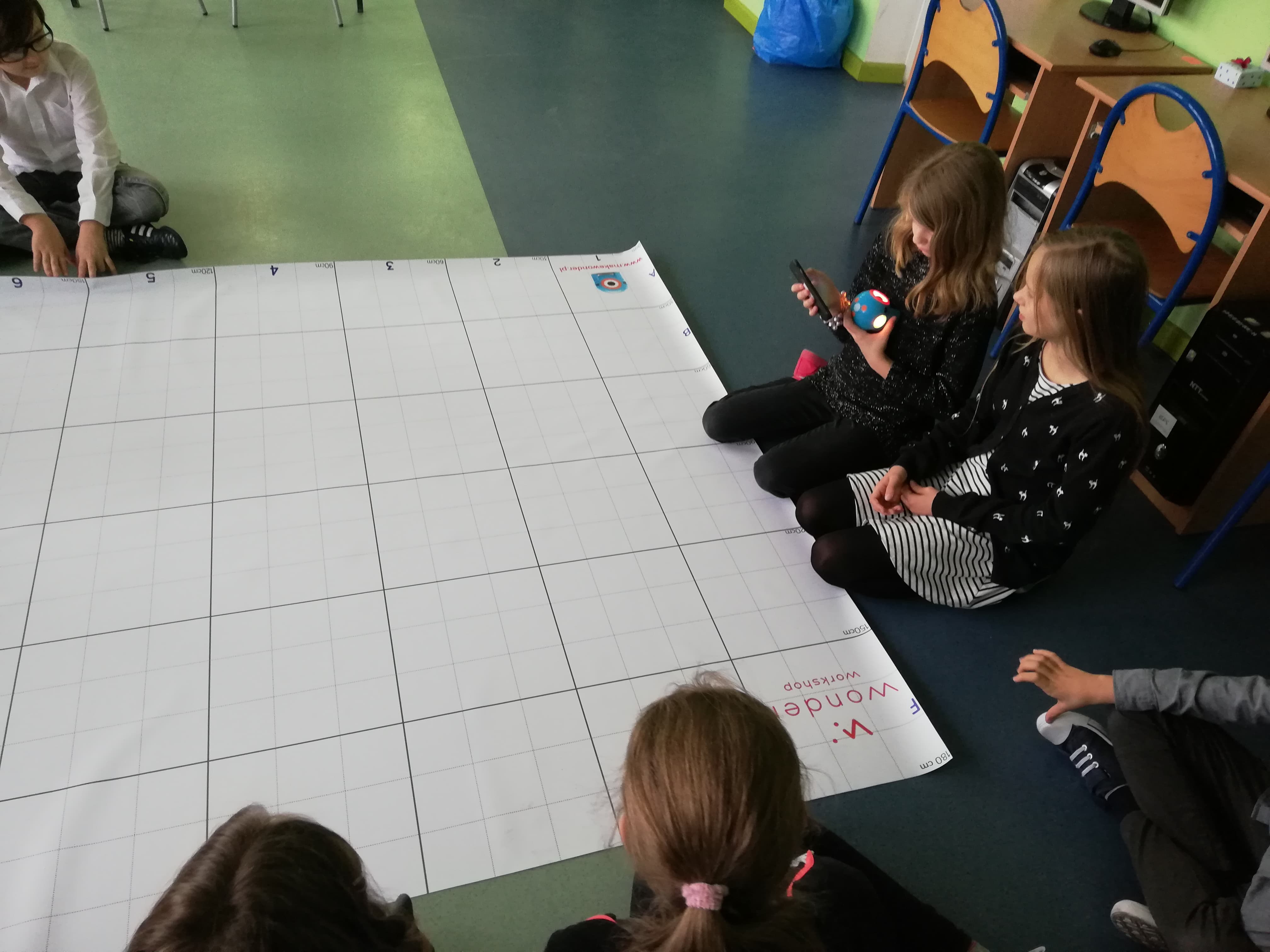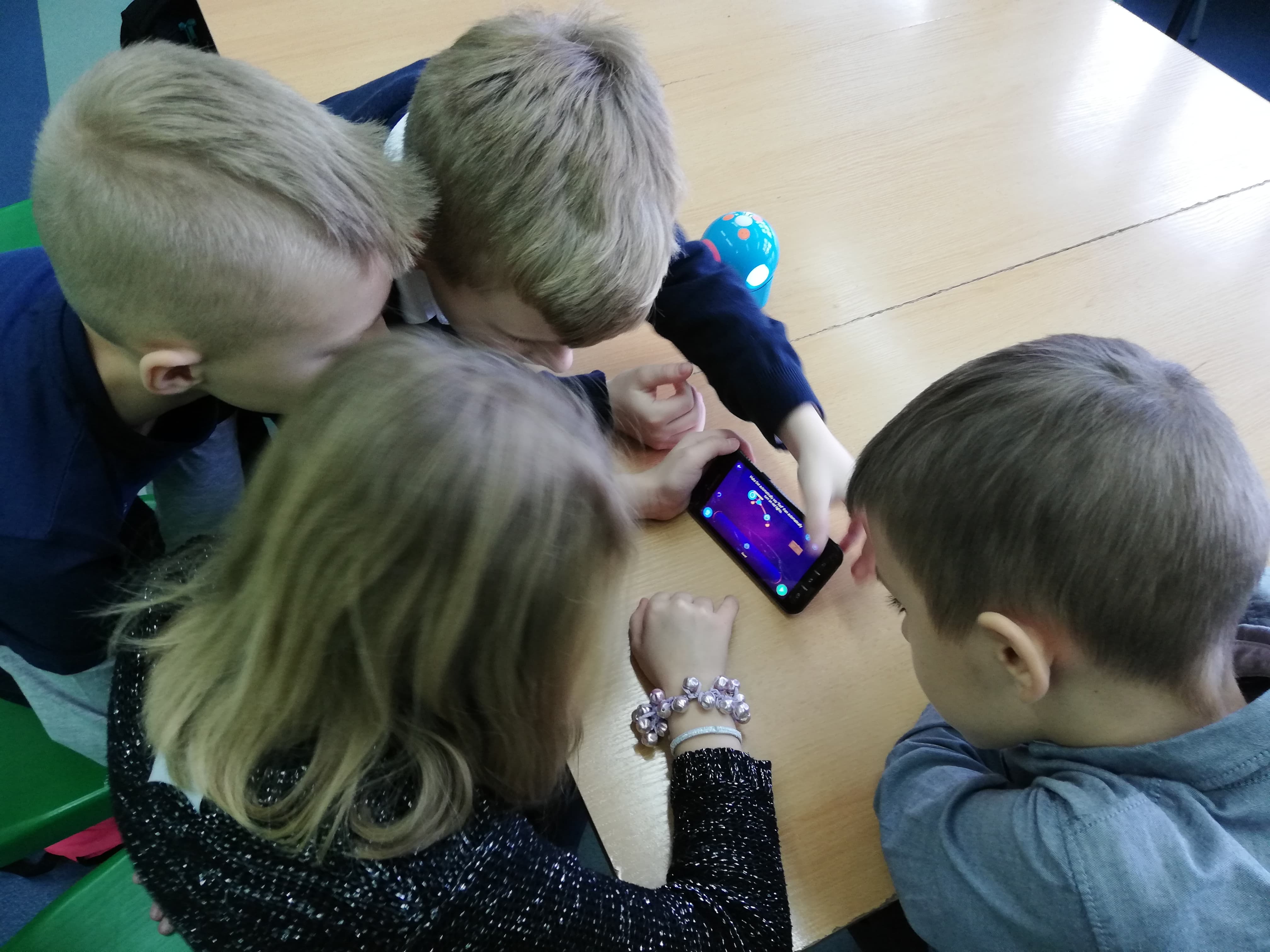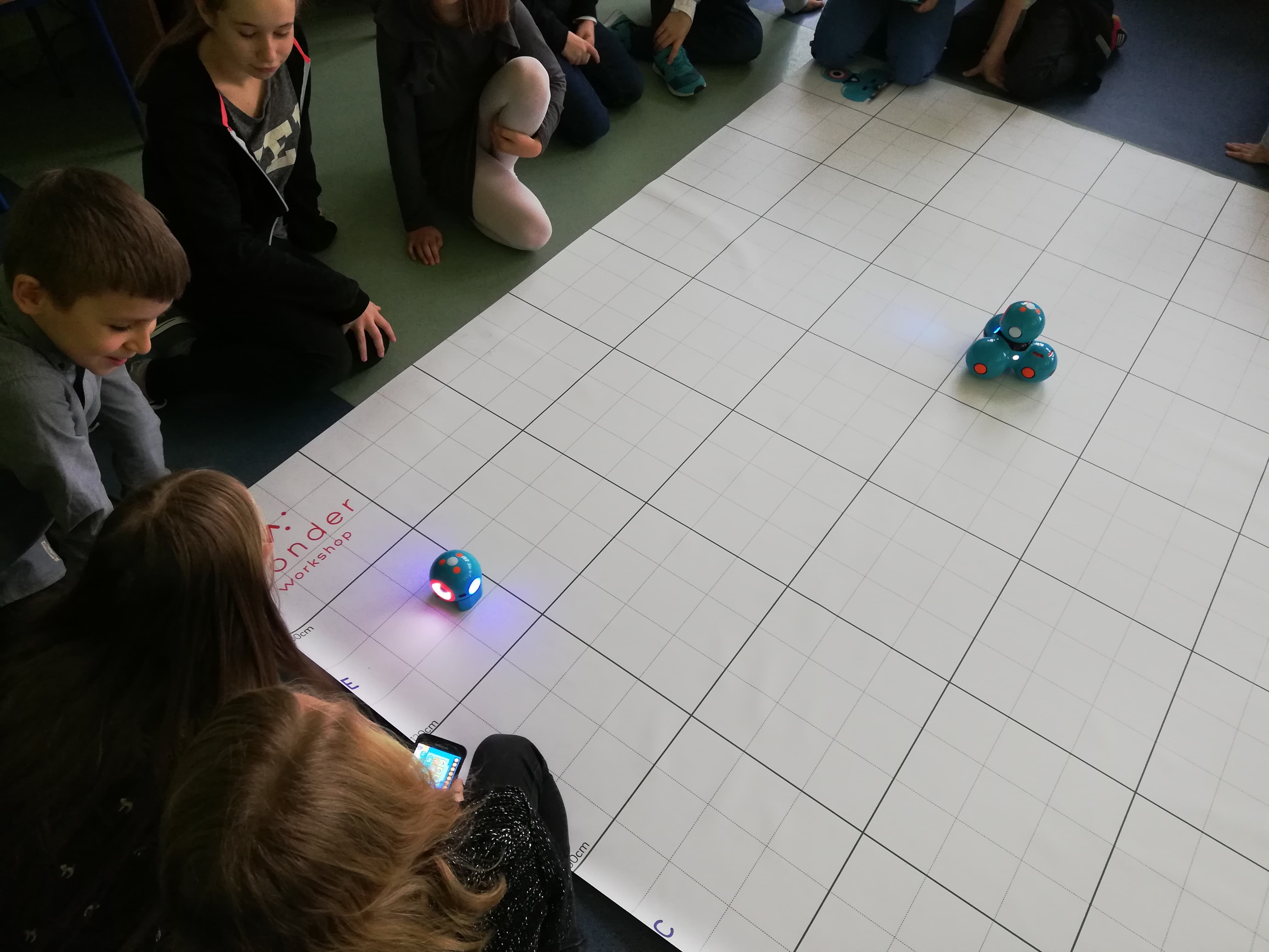 Kolejnym krokiem dla uczniów klasy 4e po pisaniu kodów w ramach Godziny Kodowania było programowanie robotów Dash i Dot. Wszyscy byli bardzo przejęci i zaangażowani w swoją pracę. Rozpoczęliśmy od prostych poleceń dla robotów: poruszanie głową, zmiany kolorów, zarządzanie dźwiękiem, poruszanie się po linii. Okazało się, że pisanie kodów dla robotów, tak aby poruszały się jak sobie wymarzymy wcale nie jest takie łatwe.