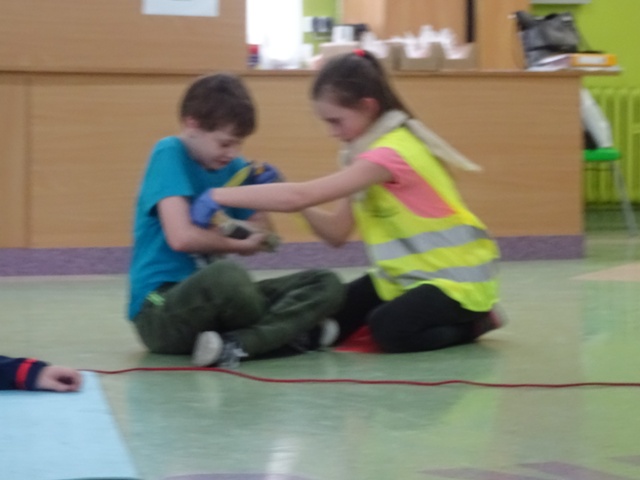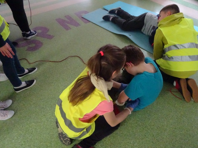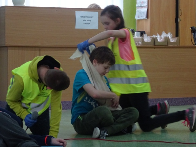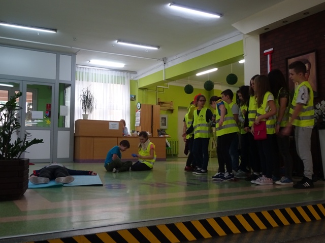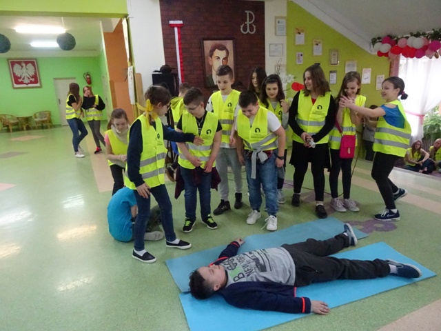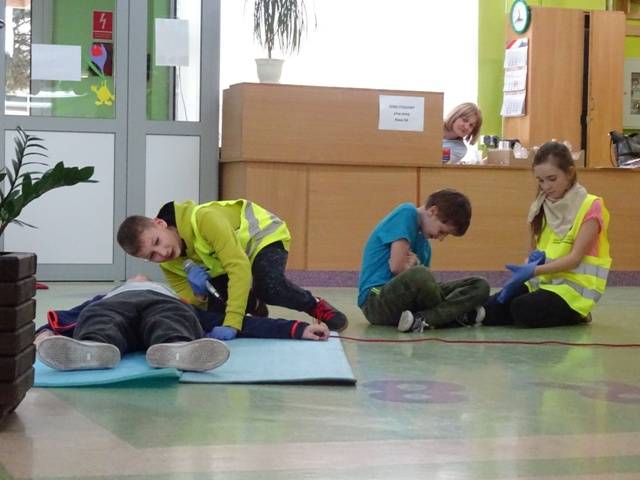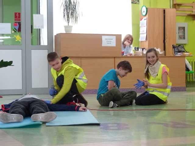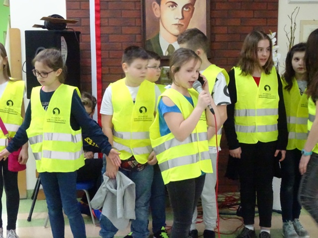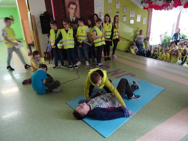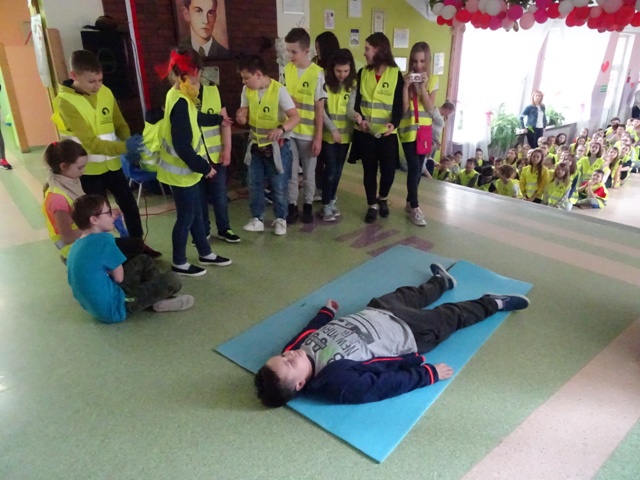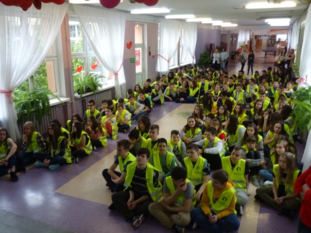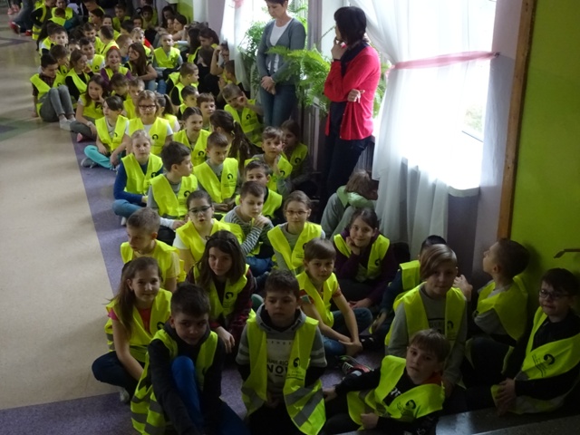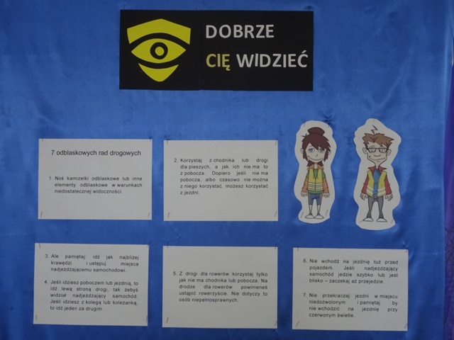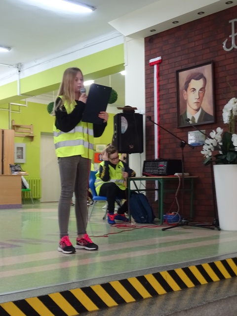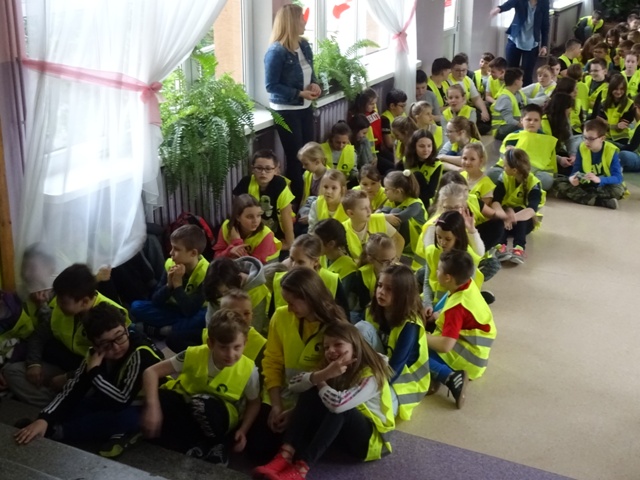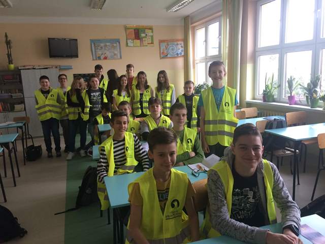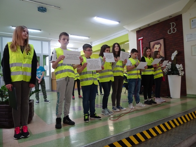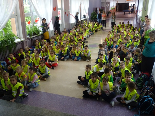 W ramach projektu wszyscy uczniowie naszej szkoły otrzymali od organizatorów kamizelki odblaskowe. Według scenariuszy udostępnionych przez organizatorów, przeprowadzone zostały lekcje wychowawcze na temat bezpieczeństwa na drodze. Uczniowie klasy 5E pod kierunkiem pani mgr Elżbiety Ambrozik przygotowali apel dla klas 1 – 8, na którym demonstrowali, jak piesi powinni się zachować na miejscu wypadku drogowego, omawiali 7 odblaskowych rad drogowych.