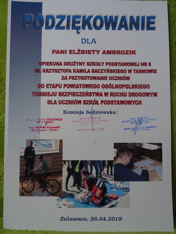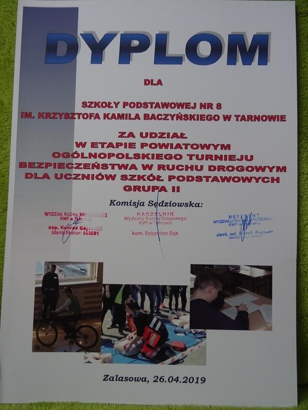 Dnia 26 kwietnia 2019r. w Zespole Szkolno – Przedszkolnym w Zalasowej odbyły się Eliminacje Powiatowe Ogólnopolskiego Turnieju Bezpieczeństwa w Ruchu Drogowym dla powiatu tarnowskiego, w którym wzięły udział 23 drużyny. Naszą szkołę reprezentowała drużyna w składzie: