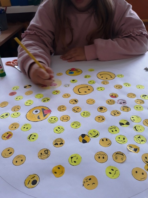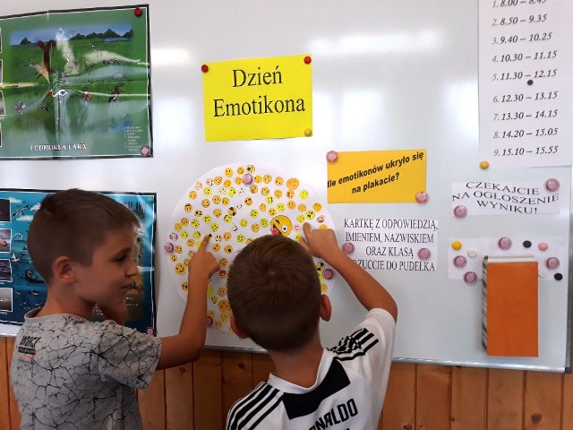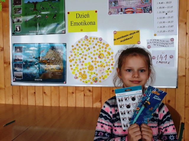 W świetlicy uczniowie przygotowali zadanie na spostrzegawczość: mieli policzyć ile emotikonów ukryło się na plakacie? Zwyciężczynią okazała się Aleksandra z 2B – podała najbardziej zbliżony wynik do prawidłowej liczby 141 emotek.