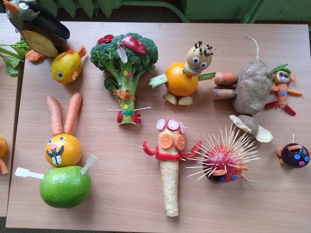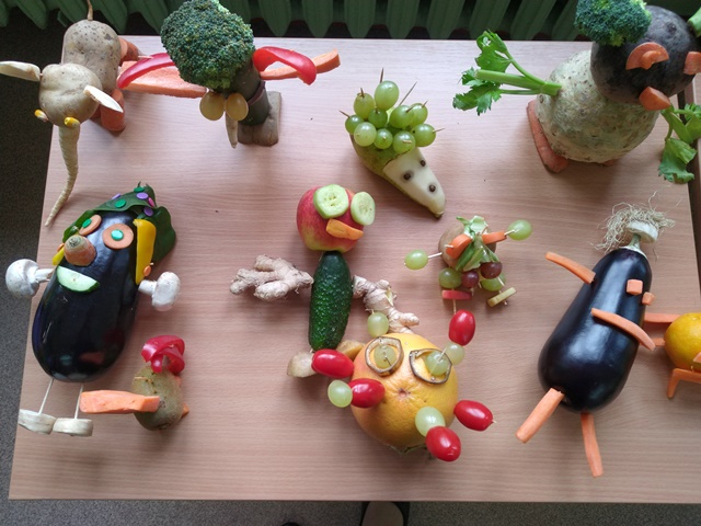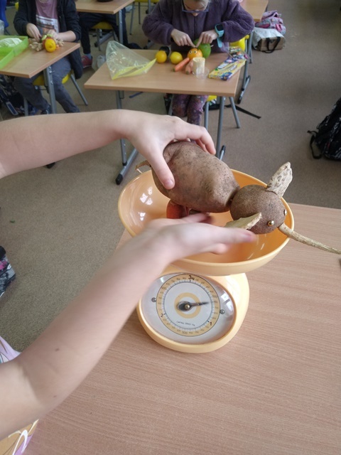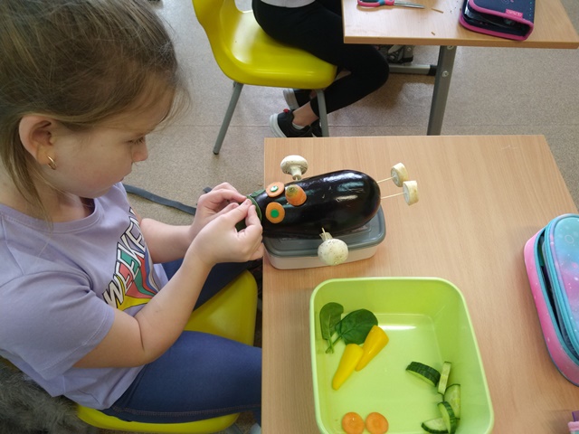 Wykonywali także ciekawe zadanie będące połączeniem kilku edukacji: przyrody, matematyki i sztuki. Po zaplanowaniu swojej pracy pod hasłem „Stworek warzywno-owocowy”, uczniowie pod opieką wychowawczyni Moniki Wolan oraz z pomocą Pani Agnieszki Kiełtyki zrobili bardzo ciekawe i kreatywne prace. Następnie każdy uczeń liczył z ilu warzyw i owoców składa się jego „Stworek”, ważył go, nadawał nazwę i opisywał z czego jest zrobiony. Uczniowie mieli także za zadanie wyszukać informacje, jakie witaminy i składniki mineralne znajdują się w warzywach i owocach, z których została wykonana praca i jak one wpływają na zdrowie człowieka.