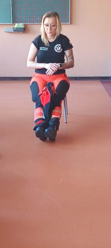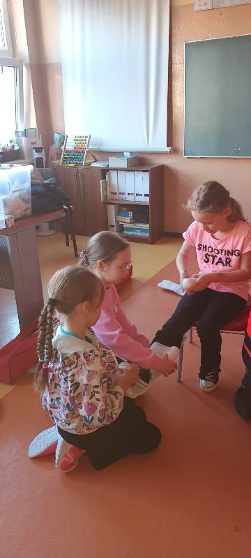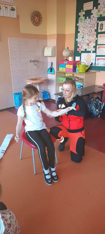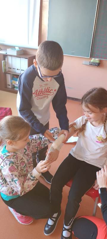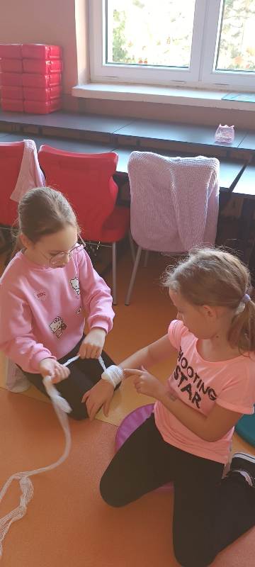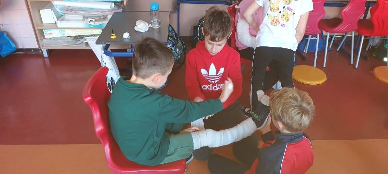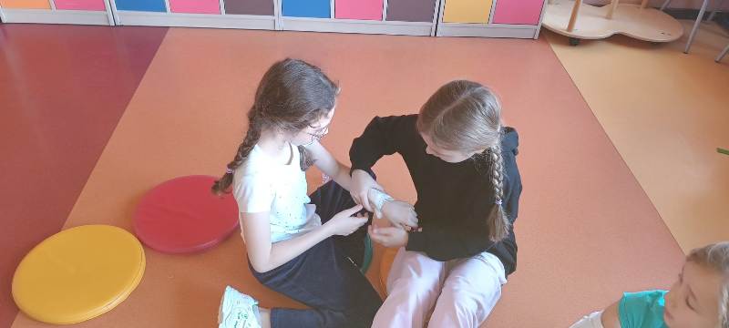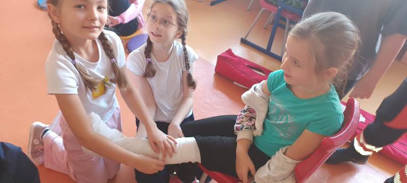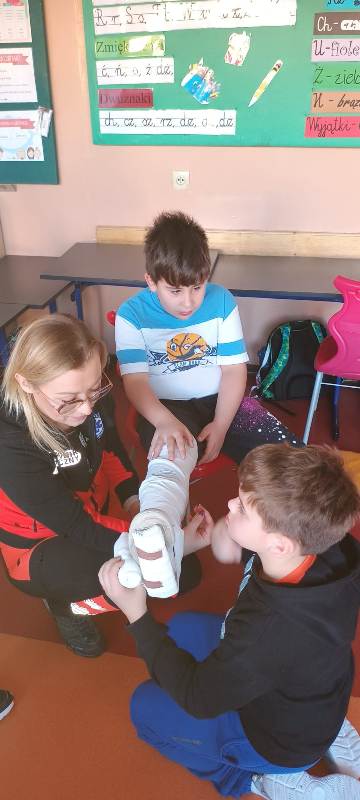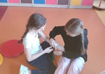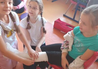 W drugiej części zajęć uczniowie pracowali w małych grupach, wykorzystując apteczki zakupione w ramach projektu. Ćwiczyli opatrywanie ran, rozróżnianie opatrunków uciskowych i osłaniających oraz unieruchamianie kończyn w przypadku złamań. Zajęcia przebiegały w atmosferze dużego zaangażowania i współpracy, co sprzyjało przyswajaniu wiedzy i rozwijaniu praktycznych umiejętności.