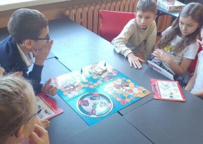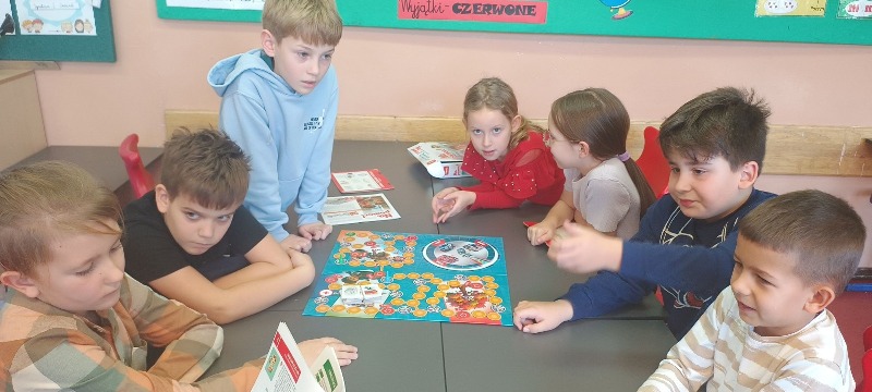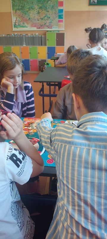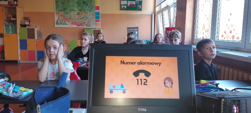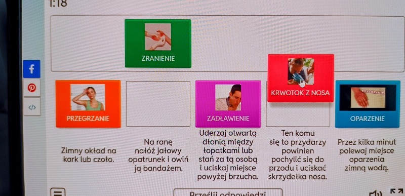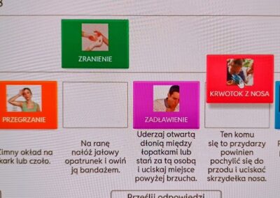 W czasie zajęć utrwalających zdobytą wiedzę, uczniowie obejrzeli prezentację multimedialną, rozwiązywali zagadki i quizy interaktywne oraz grali w edukacyjną grę planszową „Na pomoc!”, która w przystępny sposób pomogła im usystematyzować najważniejsze informacje dotyczące zasad udzielania pierwszej pomocy i również zakupiona była w ramach projektu.