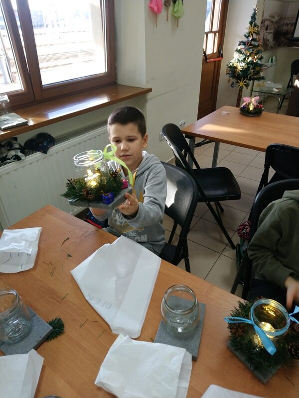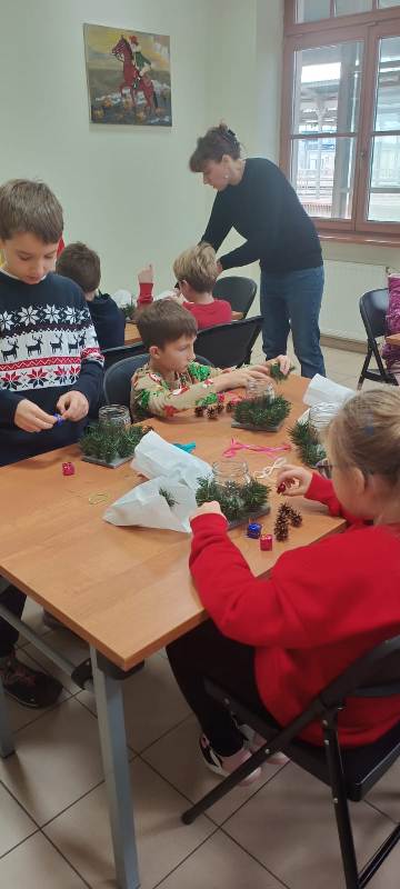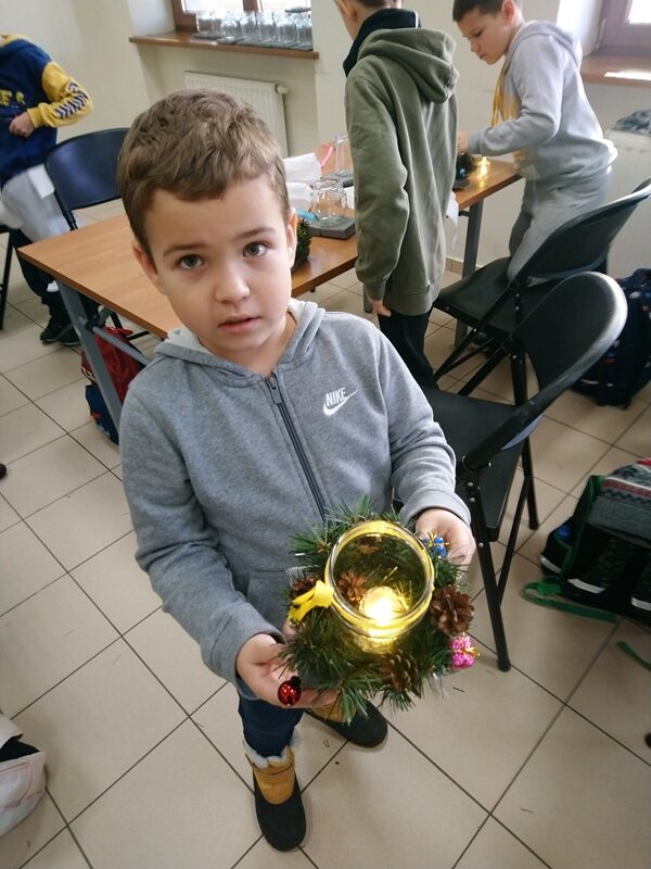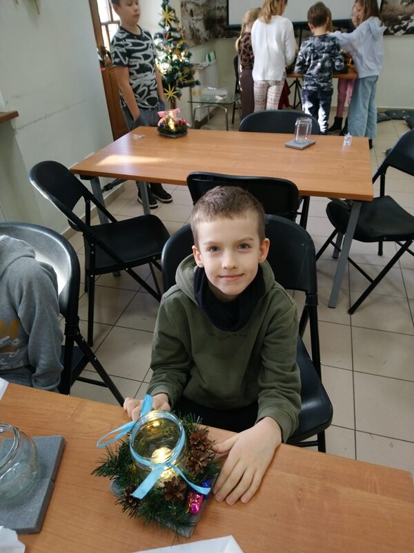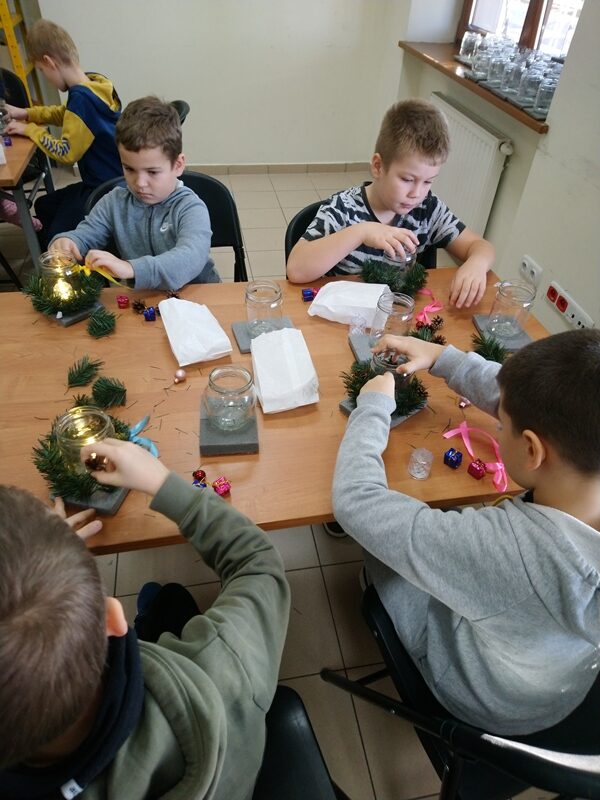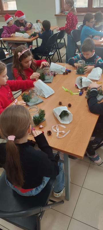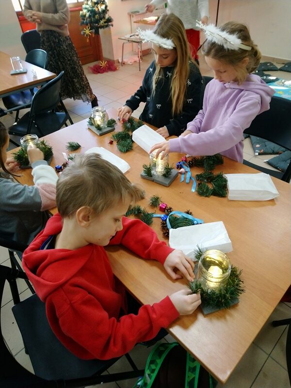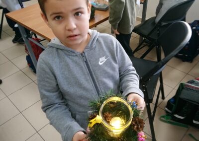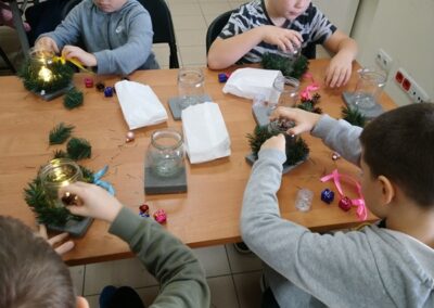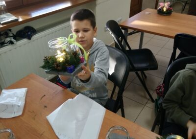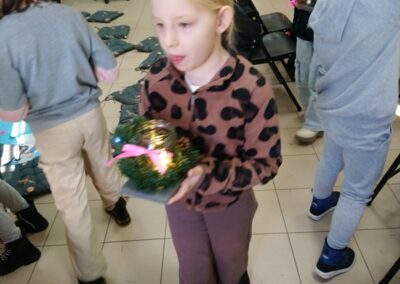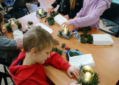 Kulminacją zajęć było własnoręczne tworzenie stroików, które nie tylko sprawiło ogromną satysfakcję, lecz także wprowadziło wszystkich w magiczny nastrój oczekiwania. Powstałe dekoracje staną się ozdobą wigilijnych stołów, przypominając o wspólnym czasie pełnym uśmiechu i wzruszeń.