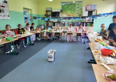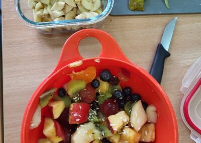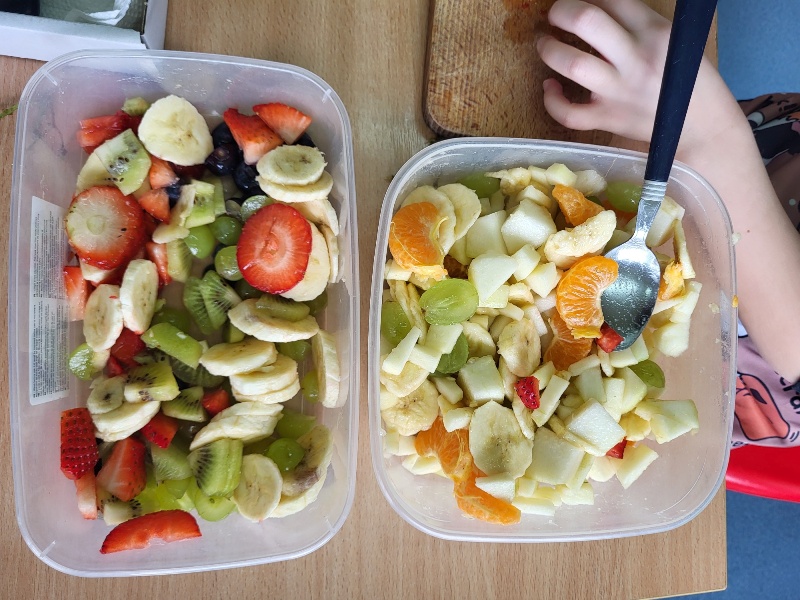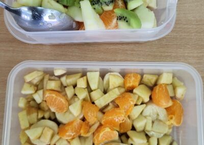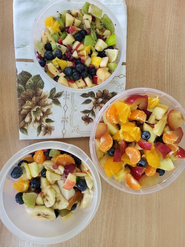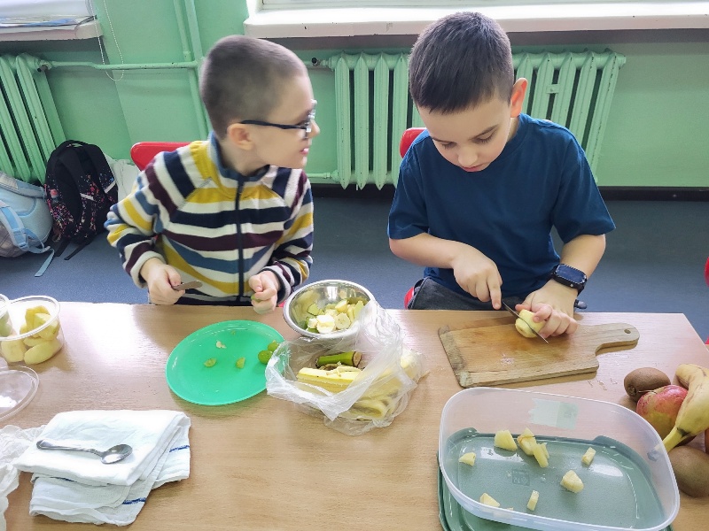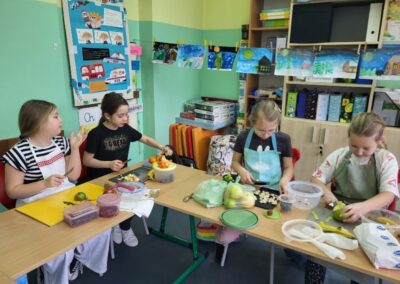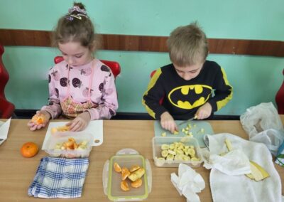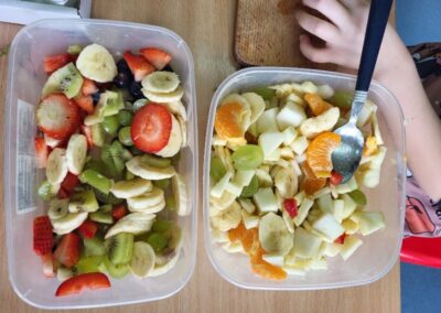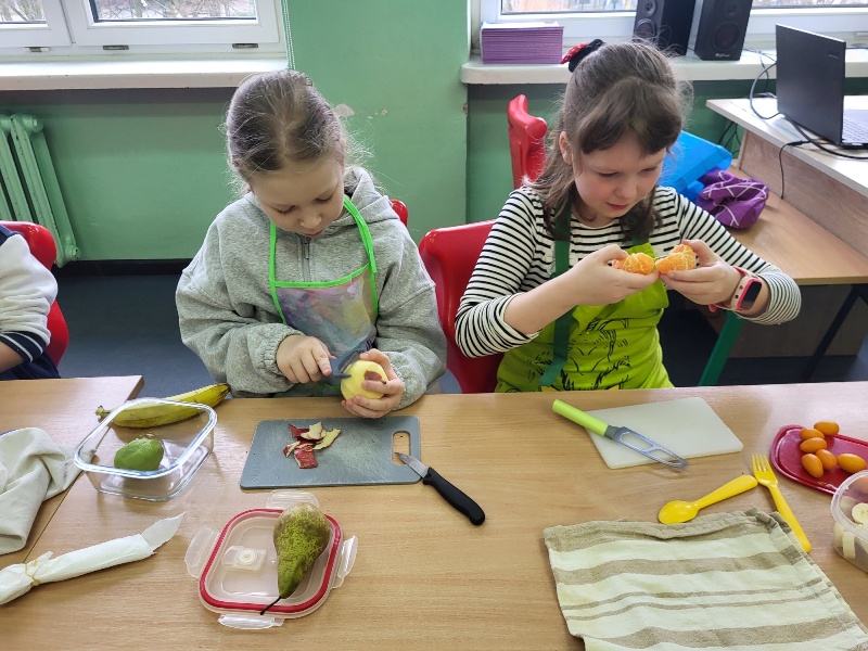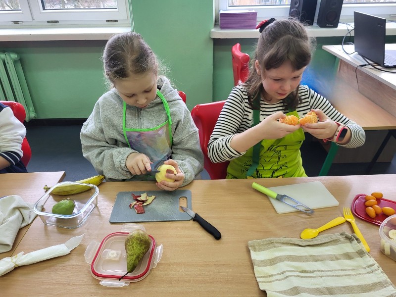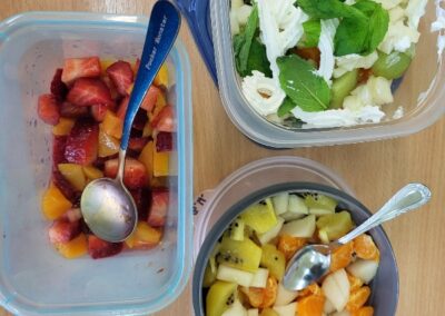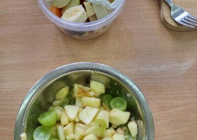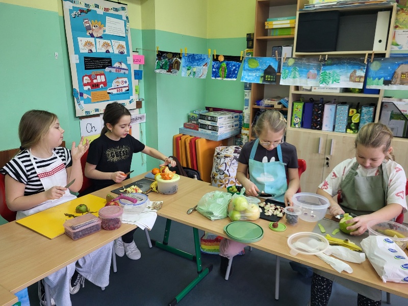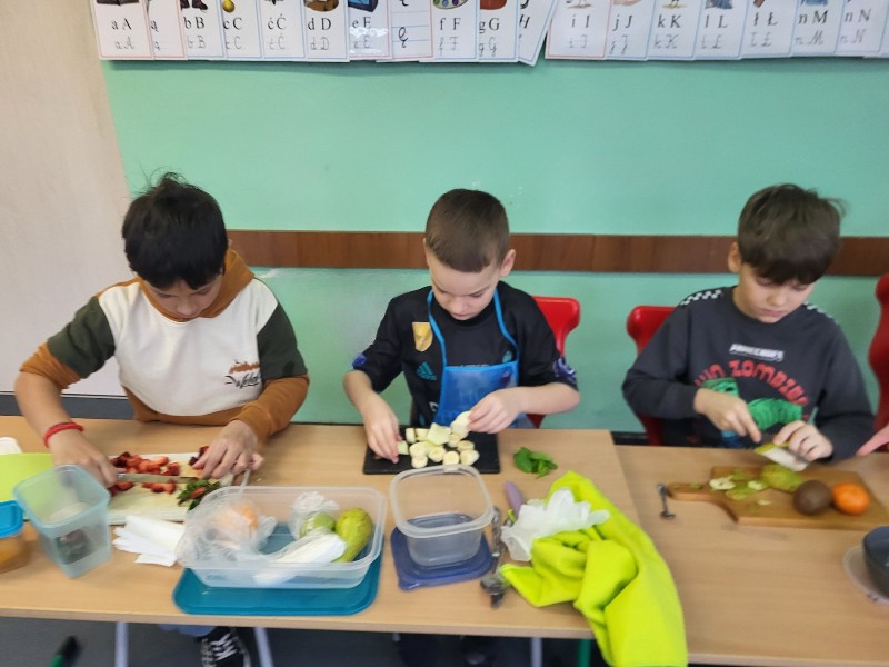 Uczniowie z klasy 2b przygotowali sałatkę według własnego pomysłu, wykorzystując różnorodne owoce: banany, kiwi, mandarynki, pomarańcze, jabłka, gruszki, borówki i wiele innych. Niektórzy udekorowali swoje porcje wiórkami kokosowymi, rodzynkami, orzechami, pestkami granatu dzięki czemu wyglądały jeszcze bardziej apetycznie.