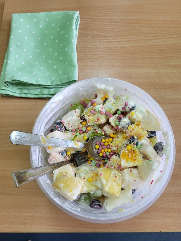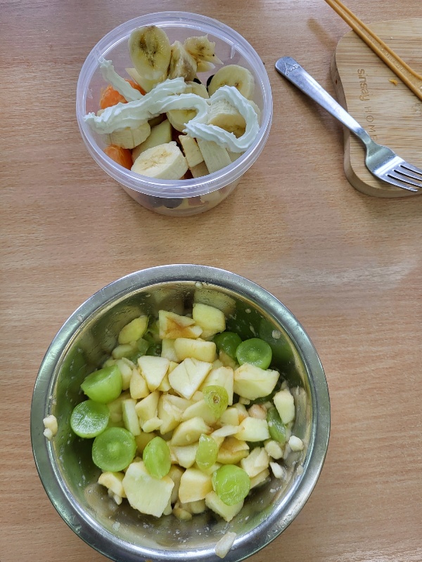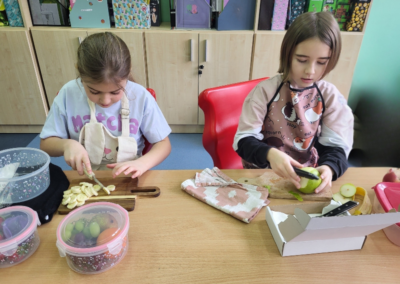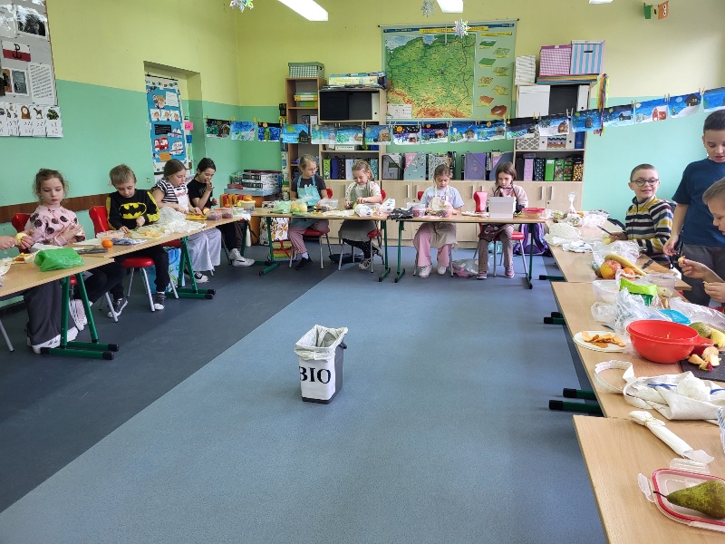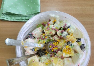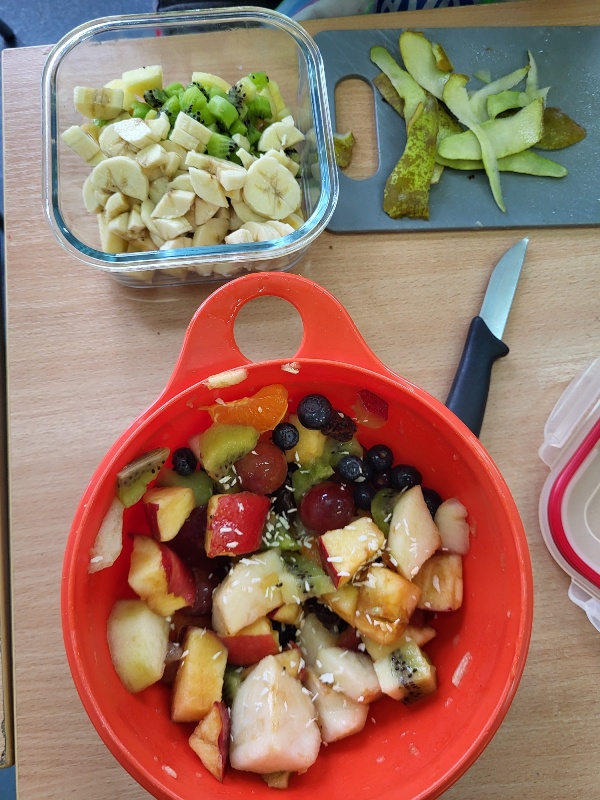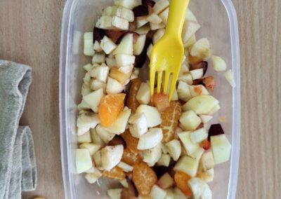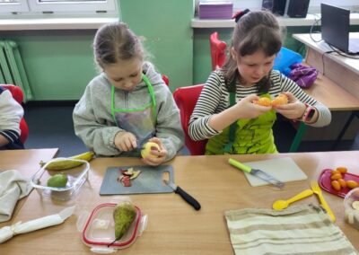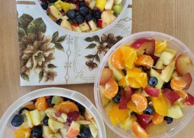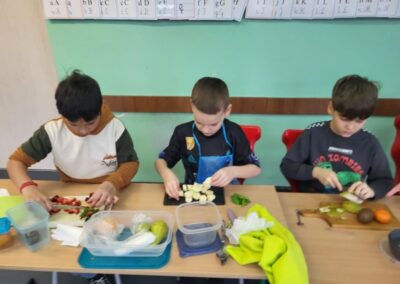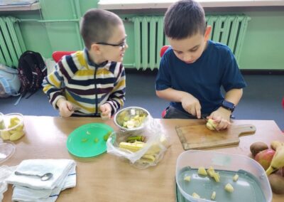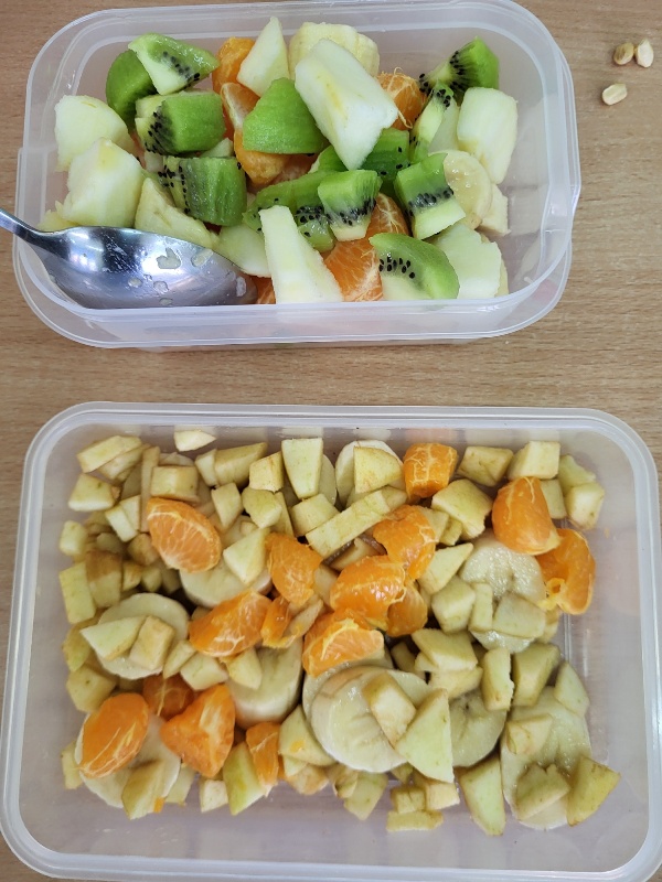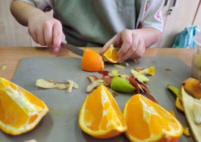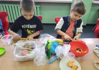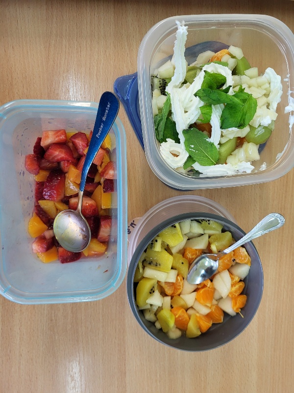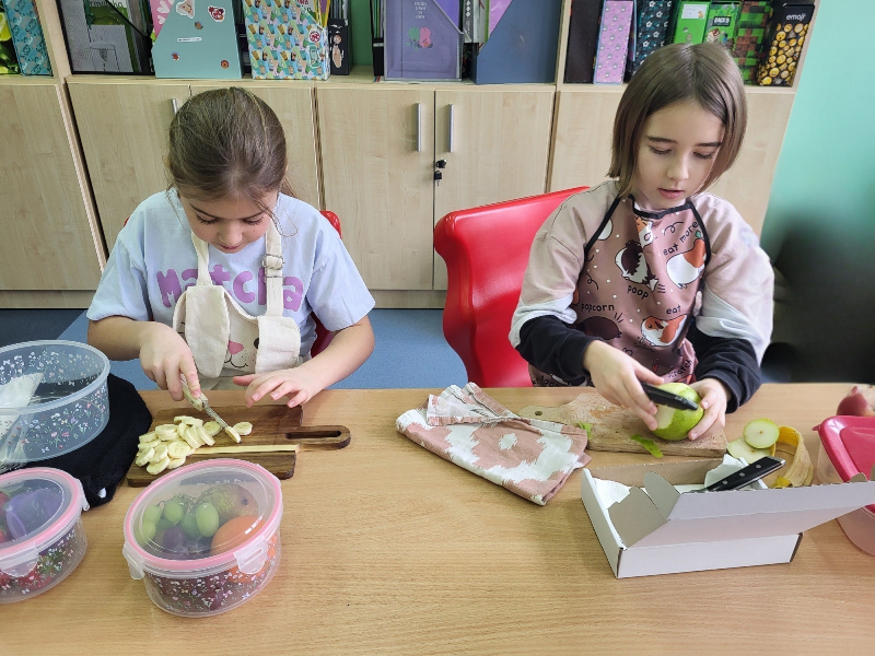 Uczniowie z klasy 2b przygotowali sałatkę według własnego pomysłu, wykorzystując różnorodne owoce: banany, kiwi, mandarynki, pomarańcze, jabłka, gruszki, borówki i wiele innych. Niektórzy udekorowali swoje porcje wiórkami kokosowymi, rodzynkami, orzechami, pestkami granatu dzięki czemu wyglądały jeszcze bardziej apetycznie.
