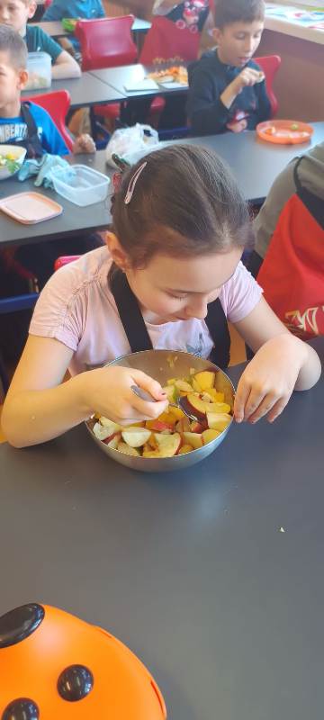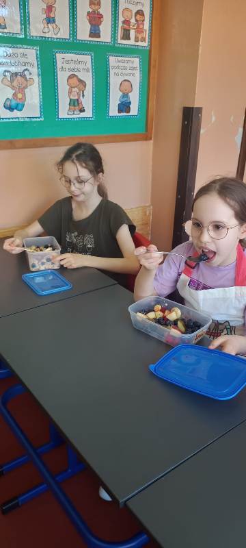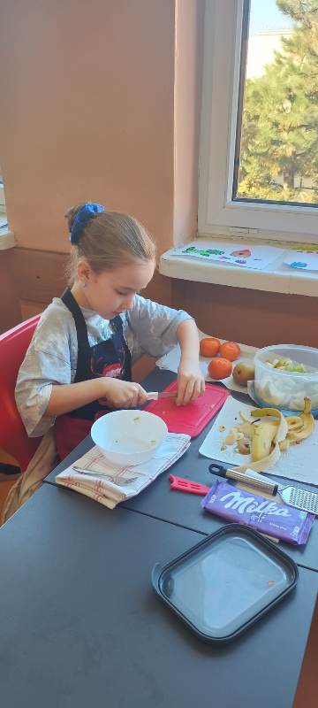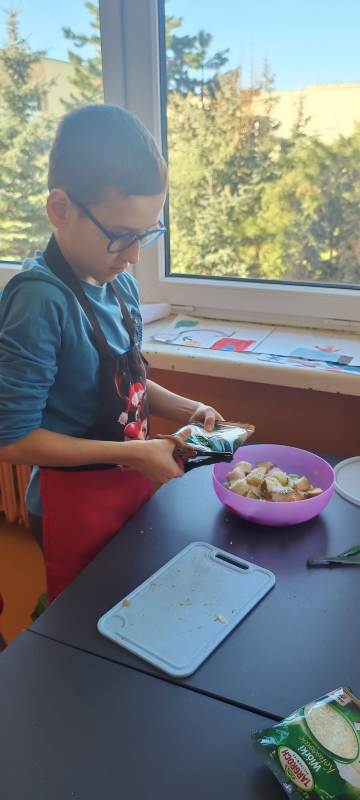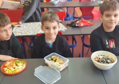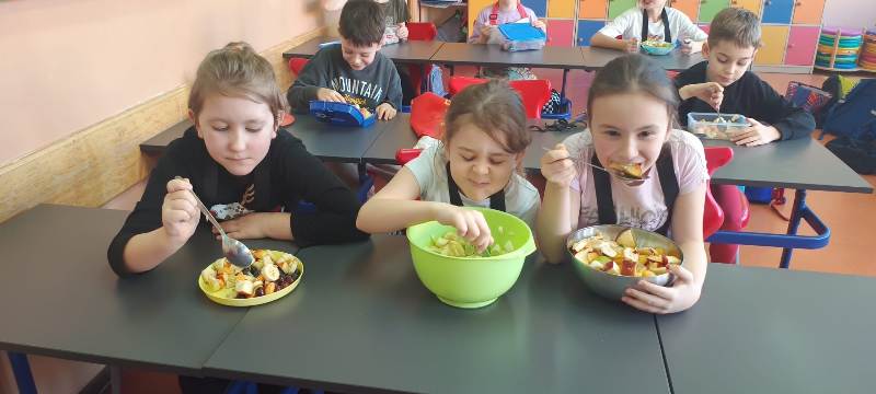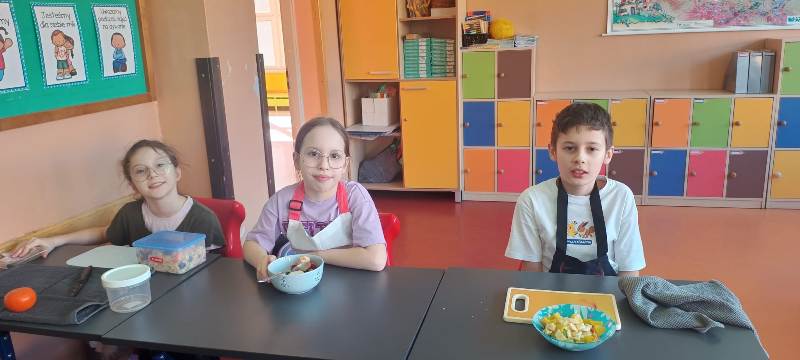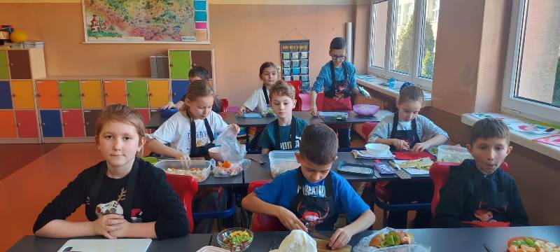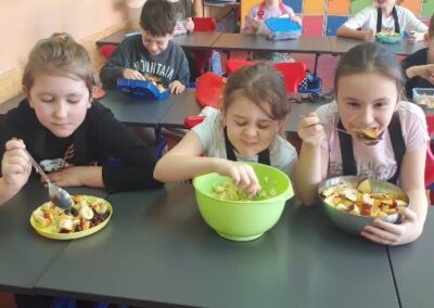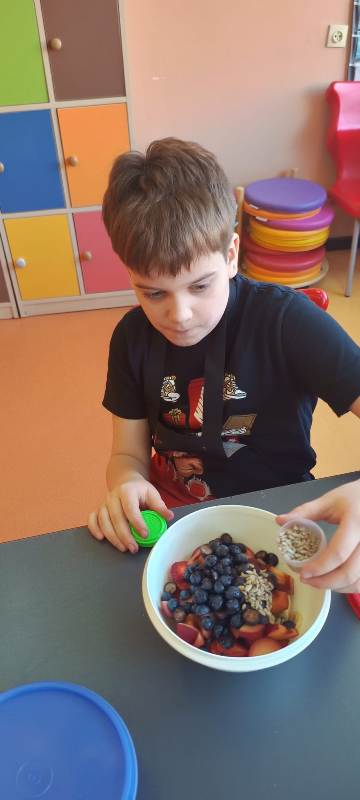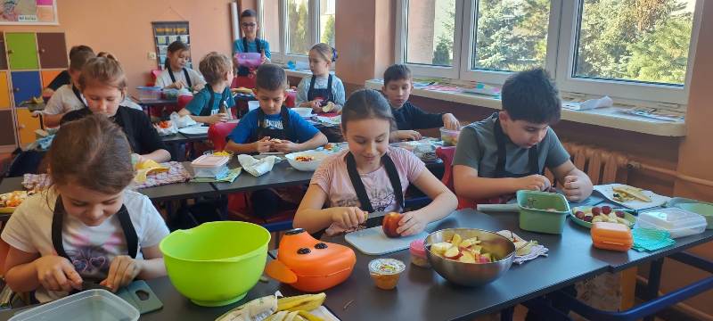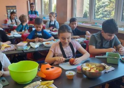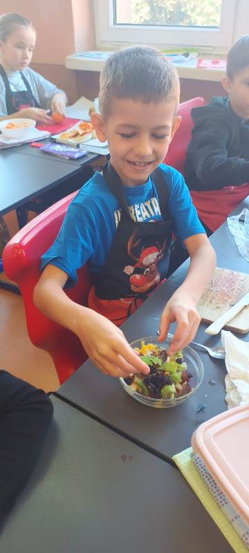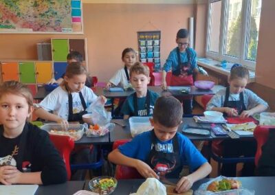 Każdy uczeń wytrwale pracował w swoim fartuszku i z odpowiednimi przyborami, dzięki czemu mógł poczuć się jak prawdziwy kucharz. Zanim jednak dzieci przystąpiły do krojenia i mieszania, przypomniały sobie zasady higieny i bezpieczeństwa, tak ważne podczas pracy z jedzeniem. Dokładne mycie rąk, czyste stanowisko i ostrożność przy używaniu narzędzi były podstawą bezpiecznej zabawy.