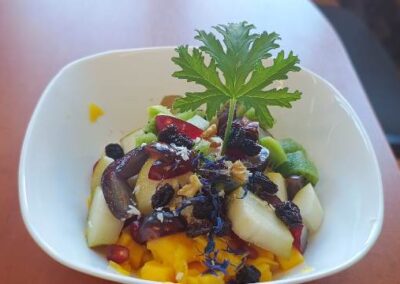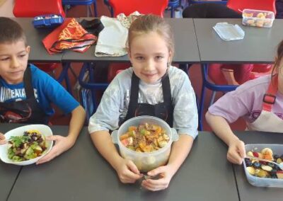 Warsztaty były świetną okazją, by porozmawiać o zdrowym odżywianiu i roli owoców w codziennej diecie. Każdy mógł samodzielnie skomponować swoją sałatkę, wybierając ulubione składniki i odkrywając nowe smaki. Powstały prawdziwe małe dzieła sztuki – kolorowe, pachnące i pełne witamin.