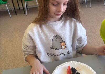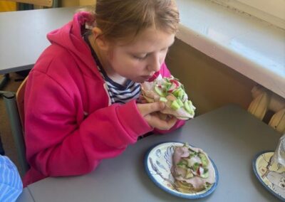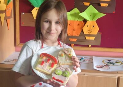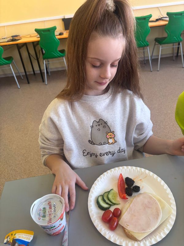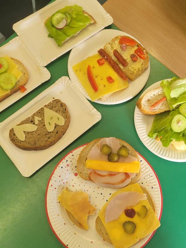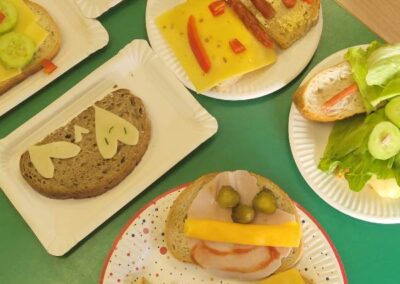 Podczas zajęć uczniowie samodzielnie przygotowywali kolorowe kanapki, korzystając ze świeżych warzyw, owoców, pełnoziarnistego pieczywa i zdrowych dodatków. Każdy mógł puścić wodze wyobraźni, tworząc kanapki w zabawne kształty i wzory, które wyglądały niemal jak małe dzieła sztuki! 🎨