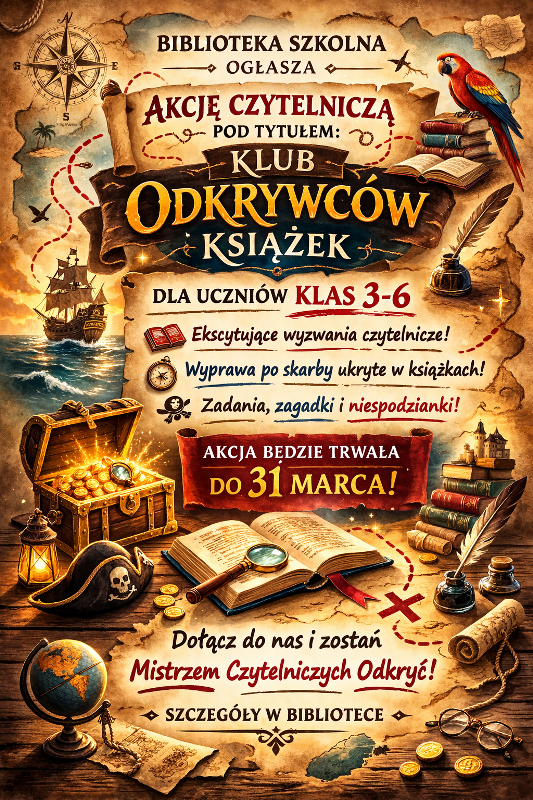 Uczniowie, którzy do 31 marca dokonają zwrotu wypełnionych kart Klubu Odkrywców Książek, wezmą udział w losowaniu nagród. Do udziału zapraszamy uczniów klas 3–6.