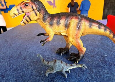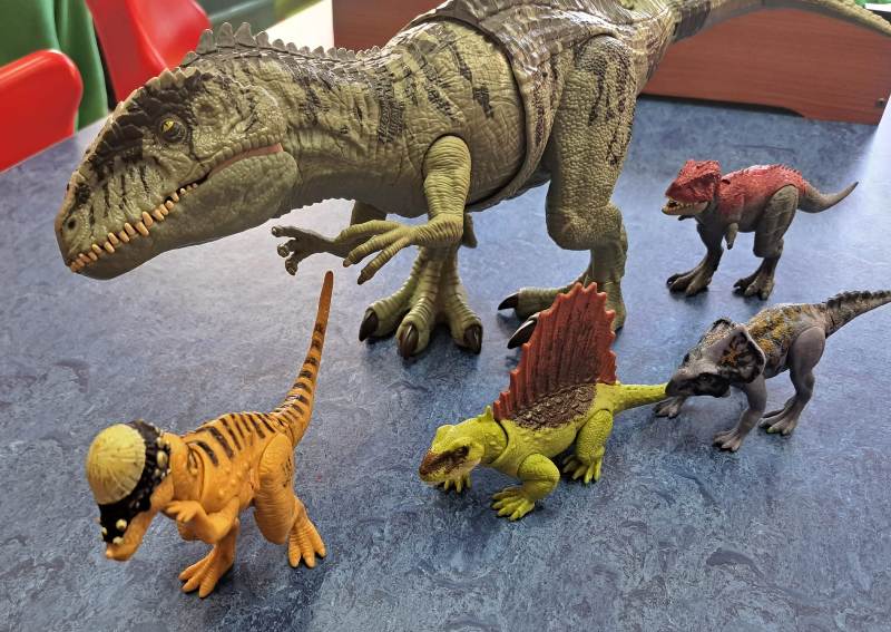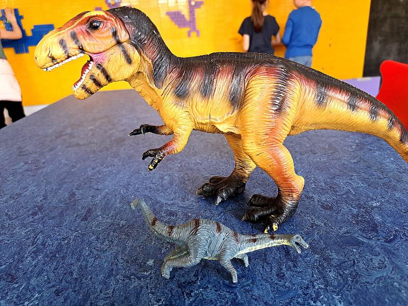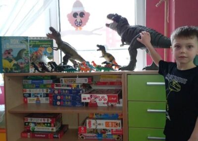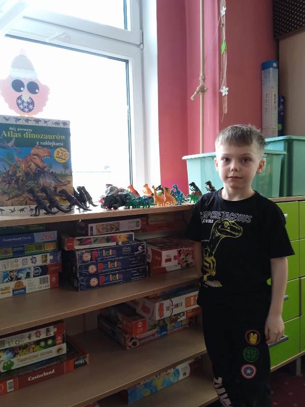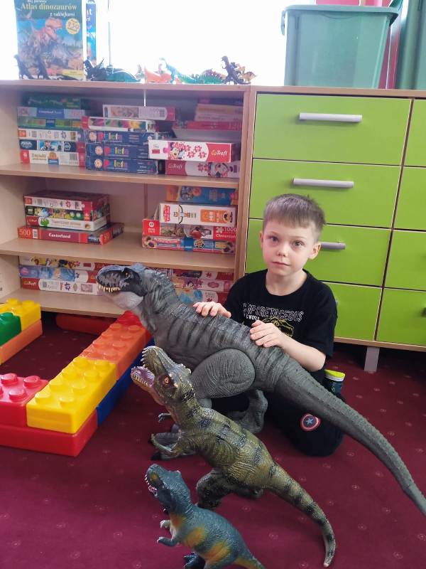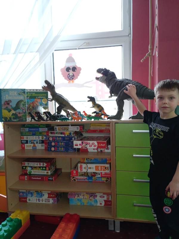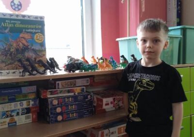 Każdy chętny mógł także przynieść i zaprezentować swoją kolekcję dinozaurów. Na stołach pojawiły się figurki małe i duże, kolorowe i realistyczne. Dzięki temu świetlica na chwilę zamieniła się w prawdziwy park jurajski.