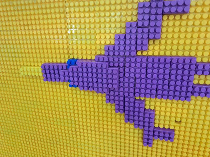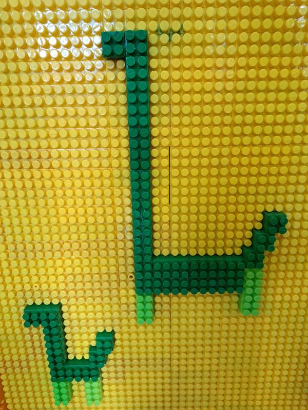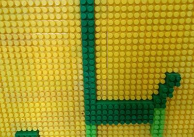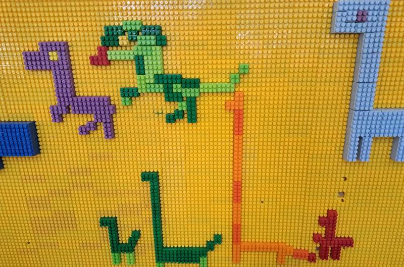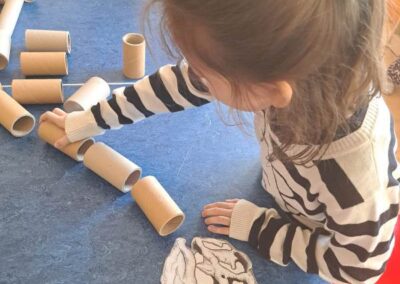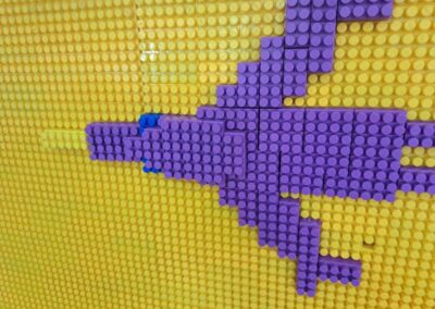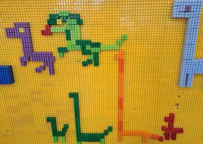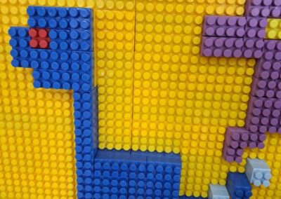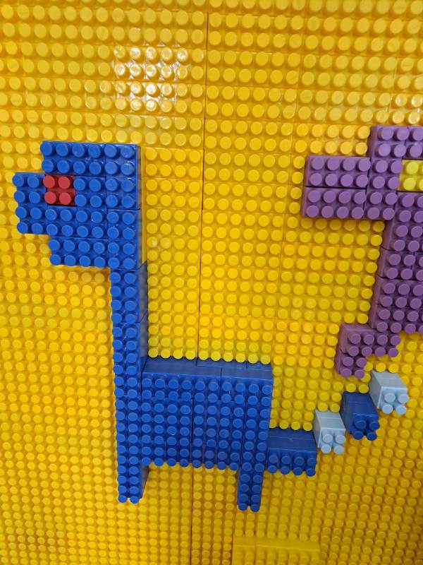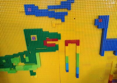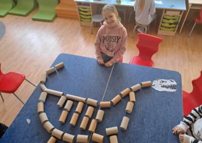 W świetlicy powstawały również dinozaury z klocków. Dzieci budowały własne prehistoryczne stworzenia, wykazując się dużą wyobraźnią i kreatywnością.