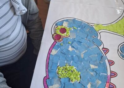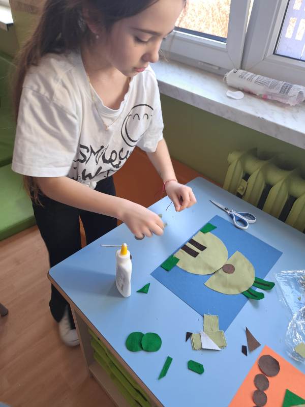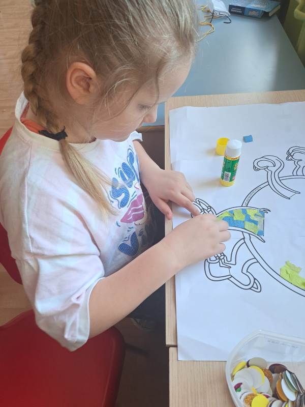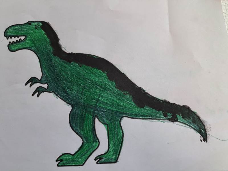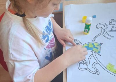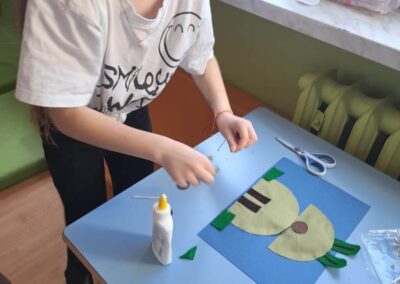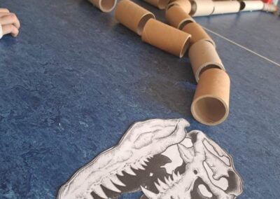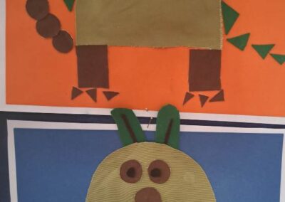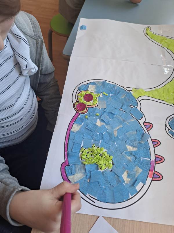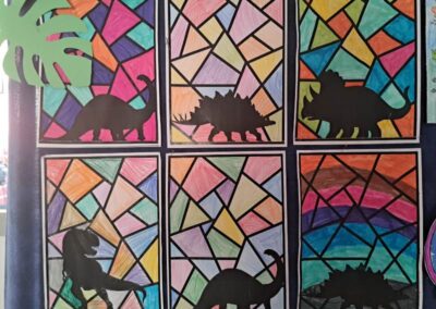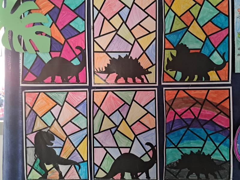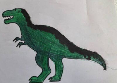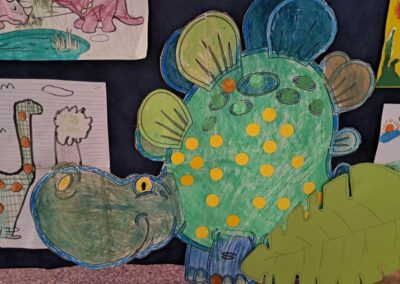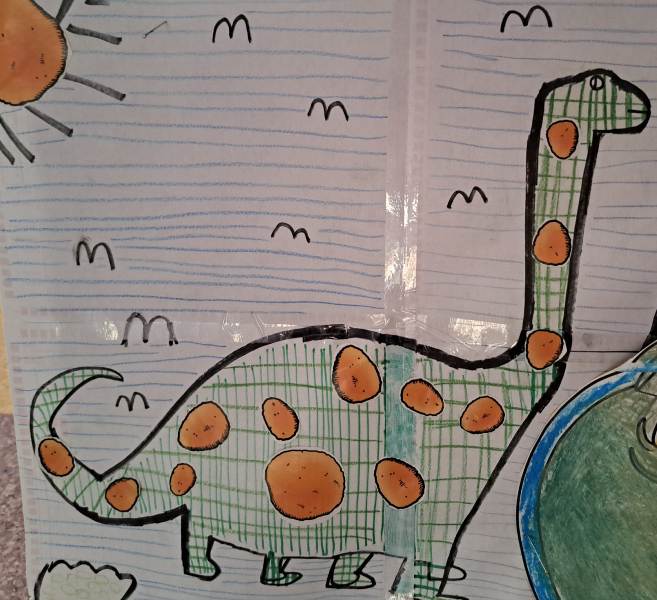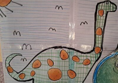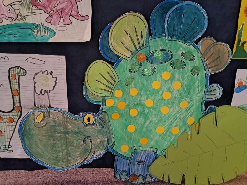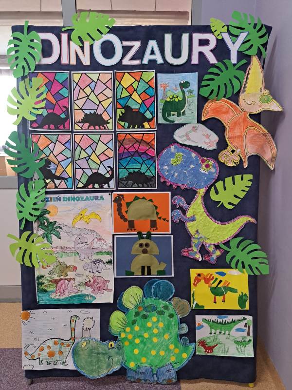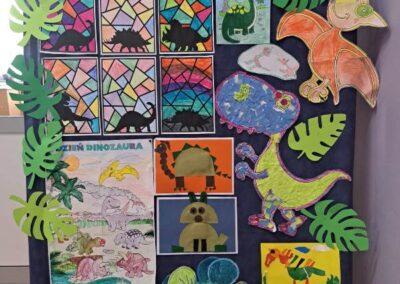Nie zabrakło również działań plastycznych. Uczniowie wykonywali prace przedstawiające dinozaury różnymi technikami – rysowali, malowali, wycinali i wyklejali kolorowe prehistoryczne zwierzęta. Z powstałych prac stworzona została prawdziwa galeria dinozaurów.