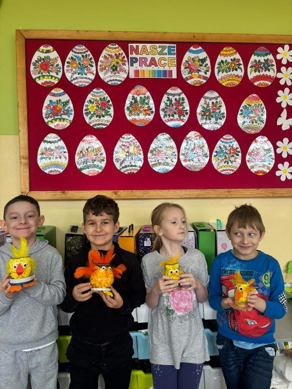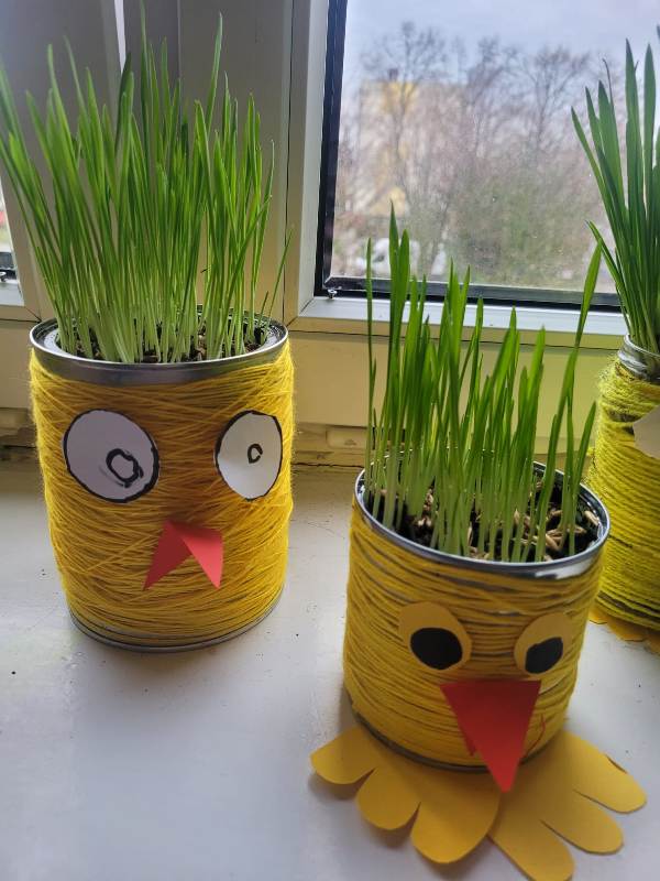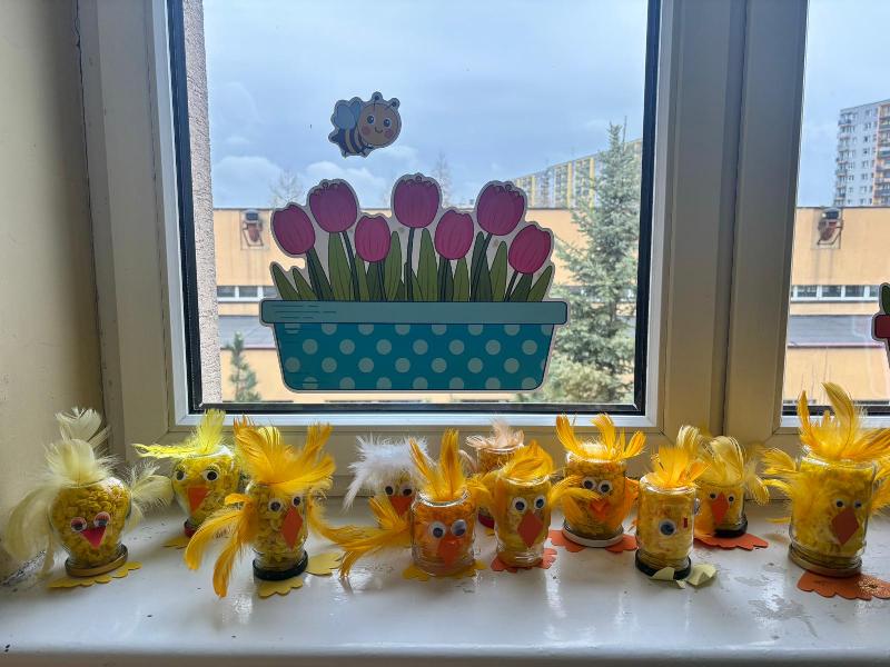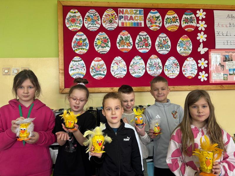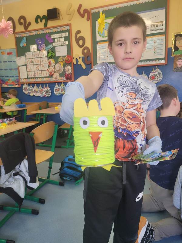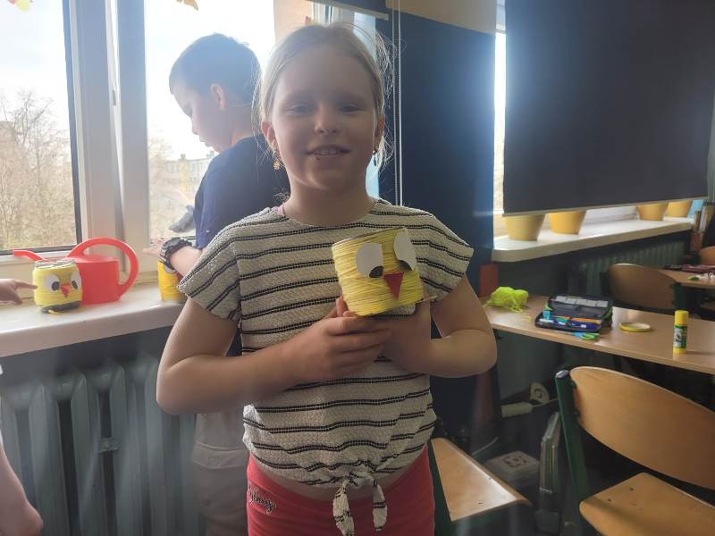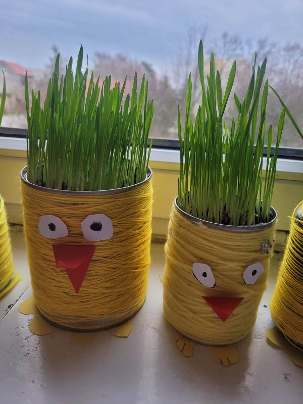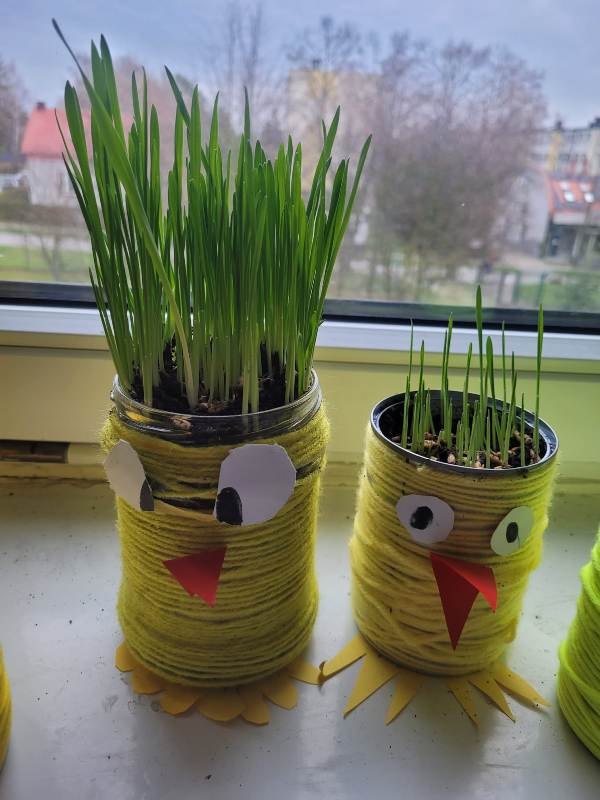 Uczniowie klasy 2a zajęli się sianiem owsa w swoich oryginalnych, kurczakowych doniczkach, które powstały z metalowych puszek lub słoików starannie owiniętych żółtą włóczką. Natomiast uczniowie klas 2b i 2e wykonali kurczaki ze słoików, wypełnione bibułą i ozdobione śmiesznie odstającymi piórkami.
